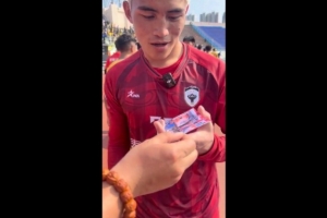 体育资讯4月1日讯 4月1日,2026泰山好水CMG群众足球邀请赛小组最后一个比赛日,山东泰安队2-2战平青海玉树队,记者牛志明赛后向玉树队门将索南龙周赠送王大雷签名照。